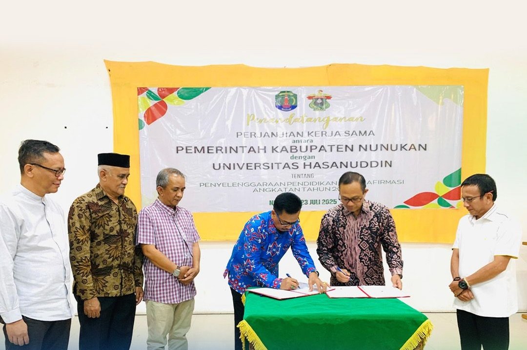 NUNUKAN – Pemerintah Kabupaten Nunukan menandatangani Perjanjian Kerja Sama (PKS) dengan Universitas Hasanuddin (Unhas) Makassar tentang penyelenggaraan pendidikan jalur kerja sama afirmasi angkatan tahun 2025. Kegiatan penandatanganan berlangsung di Aula Rapat Sayn Cafe & Resto, Rabu malam (23/7/2025).