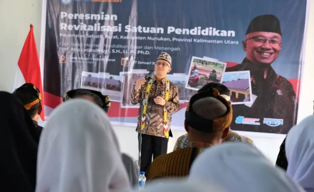 NUNUKAN – Wakil Bupati Nunukan Hermanus mendampingi Wakil Menteri Pendidikan Dasar dan Menengah (Wamendikdasmen ) Prof Dr Atip Latipulhayat S H LL.M Ph D dan Direktur SMK Kemendikdasmen Dr Arie Wibowo Kurniawan S Si M Ak saat berkunjungan ke Sebatik untuk meresmikan revitalisasi satuan pendidikan yang ada di Kabupaten Nunukan. Kegiatan ini dipusatkan di Ruang pertemuan SMKN Sebatik Barat, Sabtu (17/2026)