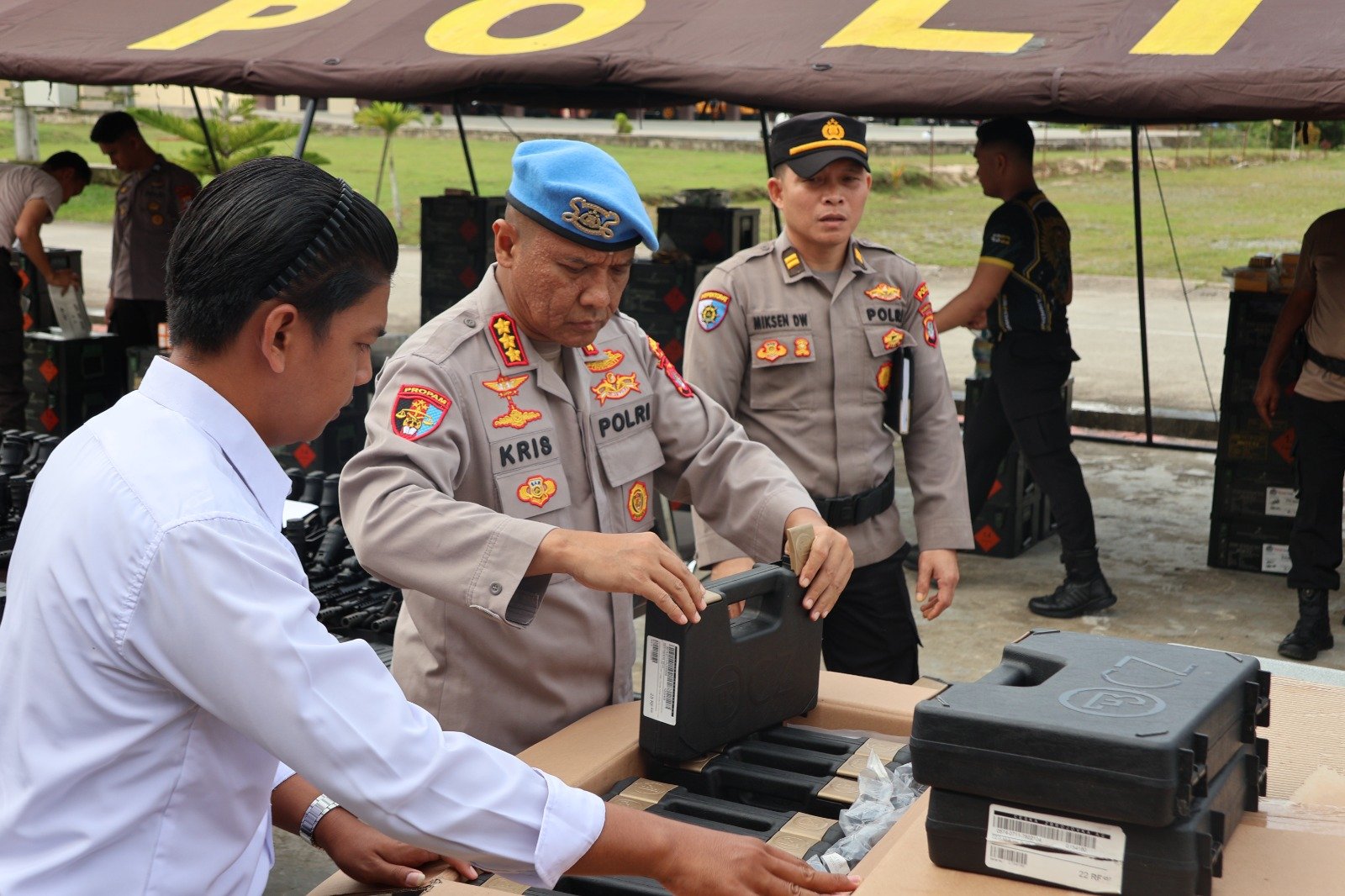 TANJUNG SELOR – Irwasda Polda Kaltara, Kombes Pol. Audy Alfrits Herman Manus, S.I.K., M.Si., CFRA., bersama Kabid Propam Polda Kaltara, Kombes Pol. Krishadi Permadi, S.I.K., M.H., melaksanakan pengecekan senjata api (senpi) di depan Gedung Logistik Polda Kaltara. Kegiatan tersebut turut dihadiri Karologistik, Kombes Pol. Herman Priyanto, S.I.K., M.A.P.